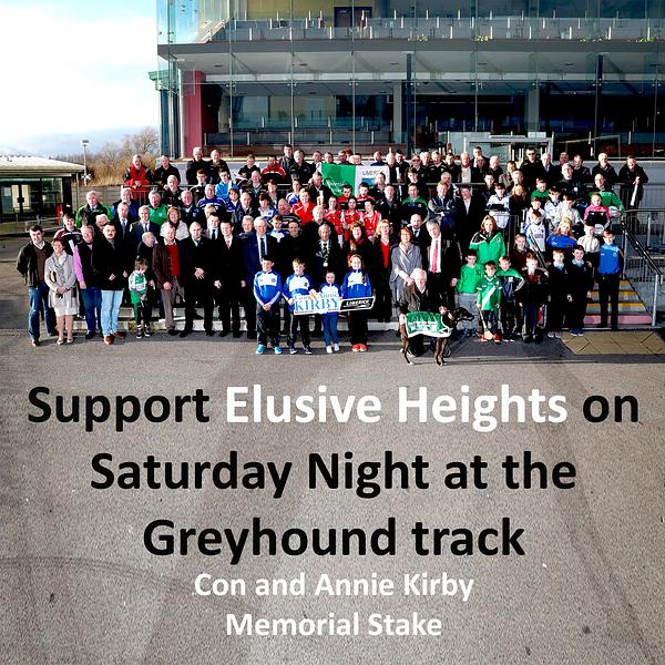 Elusive Heights is the name of the dog we will be backing on Saturday at the greyhound track in Race 4, Trap 4. Please comeout to support this great oppertunity organised by Noreen and JP McManus for the Con and Annie Kirby Memorial Stake in Limerick Greyhound Stadium. Passes for the night available from Maurice Walsh