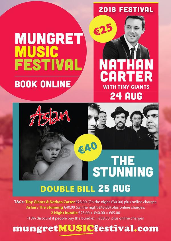 Tickets are now on sale for Nathan Carter who will preform on Friday 24th August after Tiny Giants and on Saturday 25th The Stunning and Aslan are to get the night dancing. Don't leave it too late to purchase your tickets. Friday night ticket is €25, Saturday night is €40 or purchase the 2 nigth bundle for €58.50 plus booking fees on www.mungretmusicfestival.com