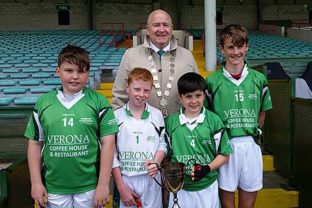Players from Mungret St. Pauls who represented Limerick City in the Mayor’s Cup Final against the City Schools Champions, Ballybrown. Limerick City won the game by 4 points. Players are pictured with the Mayor and the Cup. Brian Hassett, Diarmaid Hynes, Darragh Hogan and Conor Horgan.