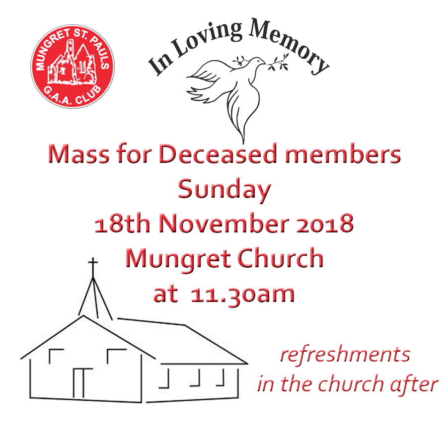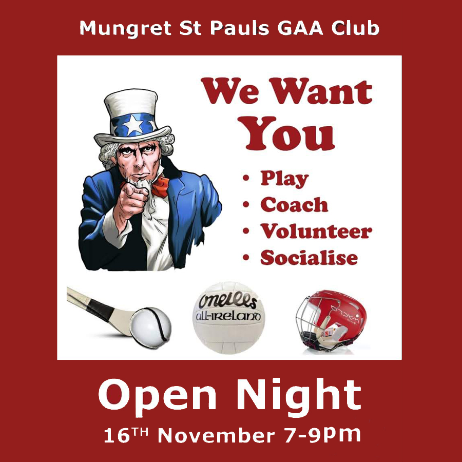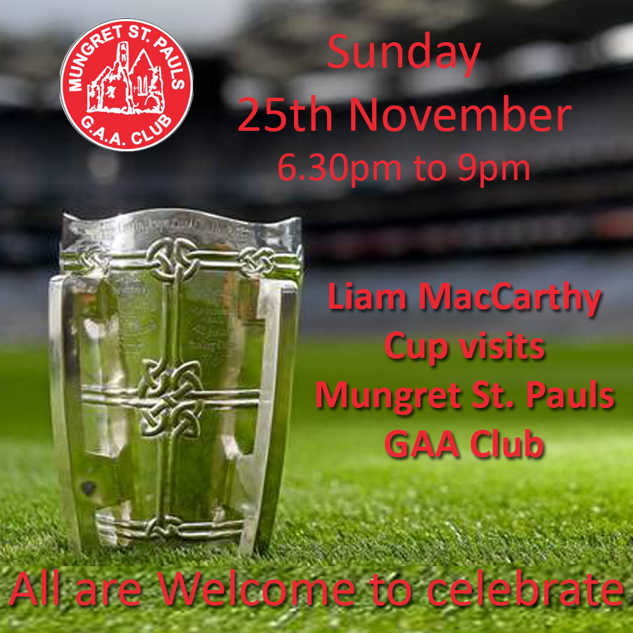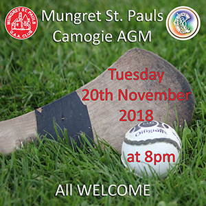 Our AGM will take take place on Sunday 16th December at 6.30pm in the clubhouse. All motions/nominations for discussion at the AGM need to be sent to secretary.mungret.limerick@gaa.ie by 6pm of Saturday 24th November.