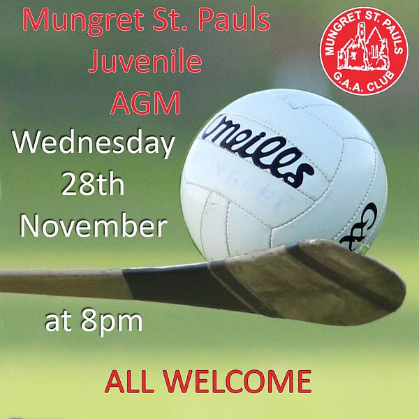 The Juvenile section of the club will hold their AGM on wednesday 28 November at 8pm. All nominations and motions to be forwarded to the secretary on secretarybng.mungret.limerick@gaa.ie We look forward to seeing you on the night.