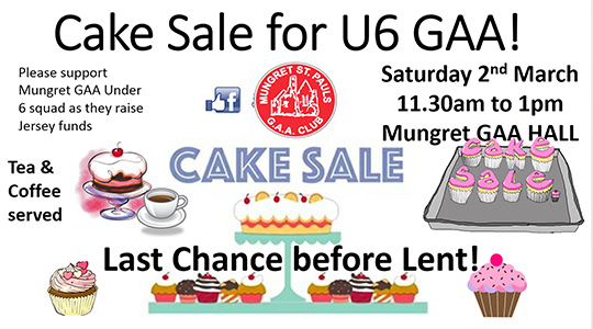 Saturday we gambled with the weather and lost. Our Under6 footballers went out for their usual 11am Saturday session but got caught in the worst hour of the day for bad weather (it was fine afterwards!). Fair play to them though, they stuck it out and finished the session, doing their drills and their games. Fundraising for Jerseys continues as we collect the sponsorship lines this week. We will also hold a CAKE SALE on Saturday March 2nd – last weekend before Lent! We’d like to thank the Juvenile section and Mungret St. Pauls Club for their continued support with new sliotars and footballs for these budding young Players. Football Saturdays 11am, hurling Mondays 6pm.