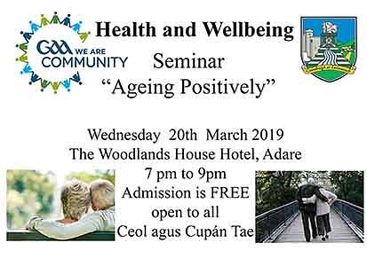 Limerick GAA Health & Well Being Committee were asked by Croke Park to host the " Ageing Positively" Seminar in the Woodlands on Wednesday 20th March 7-9pm. The event is free to GAA and non GAA people . TILDA who conducted a 10 year survey with over 8,500 people over 50 yrs will be presenting their findings on the night through Professor Rose Ann Kenny who is a leading expert in this area. There will also be music and light refreshments on the night. . To book a seat ring 01 8964120 ,however walk ins are welcome on the night. Eamon Rea former Limerick hurler is the Limerick GAA ambassador for the event.