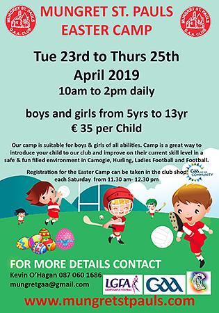 Mungret St. Pauls are delighted to be hosting our 3 day Easter Camp from Tuesday 23 to Thursday 25 of April from 10am to 2pm this year. New for 2019, you can register on line (similar to club registration) On our website www.mungretstpauls.com in the DOWNLOADS section you can click on the link, or you can download the forms and hand in with the appropriate payment to the club shop on a Saturday from 11.30am to 12.30pm or on the first day of camp.