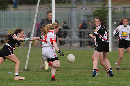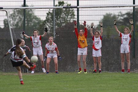 The second half Mungret St. Pauls had the breeze and scored 2 quick points to draw the game. Knockainey worked the ball well up the field and scored their second goal. A bad tackle in the Knockainey square produced a penalty for Mungret St. Pauls which was well taken and drew the game again. Both sides saw the ball wide of the uprights but at the Mungret St. Pauls goal the ball was passed by a Knockainey player across the front of the goal to a waiting team mate who knocked it into the back of the net. Knockainey tried to follow it up with another point but they hit the upright and went back out for Mungret St. Pauls to try get back on the score board but were unlucky to hit the cross bar. Knockainey kept a heavy presence in the Mungret St. Pauls back line and worked out a point from free and their last score of a goal. Mungret St. Pauls were 6 behind and into injury time, the ball was bounced off the upright again but Mungret St. Pauls players were waiting and turned what could have been a point into a goal. They put all they could into securing one more goal but were unfortunate to be denied by the steady Knockainey defense. Well done to the girls in their valiant performance.