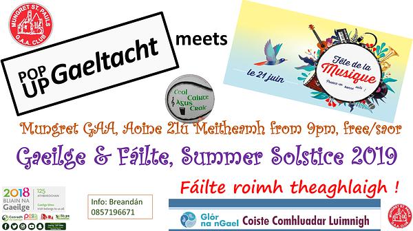 For those of you who would like to try out your ‘cúpla focail’ in a relaxed manner, there will be a ‘Pop Up Gaeltacht’ in Mungret GAA bar on Friday 21st June, from 9pm onwards. (Free Entry).