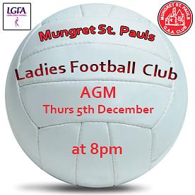 Mungret St. Pauls Ladies Football AGM will take place on Thur 5th Dec at 8pm in the Clubhouse.