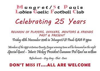 All past, preset players, coaches and officers are welcome to attend the Club house on Friday 18 November in celebration of the 25th Party for Mungret St. Pauls ladies Football. Doors open at 8.30pm.