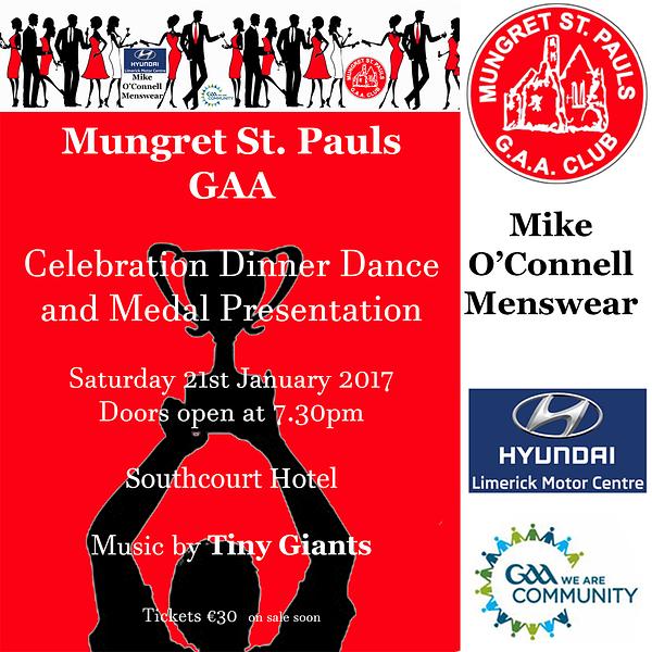 On 21 January the club are holding a Dinner Dance in the South Court Hotel. Doors open at 7.30 with music by Tiny Giants. Ticket €30 each are now on sale by contacting Brian O'Halloran or Maurice Walsh, or you can purchase tham on a Monday night from 9.30pm in the club bar. An entertaining night expected by all.